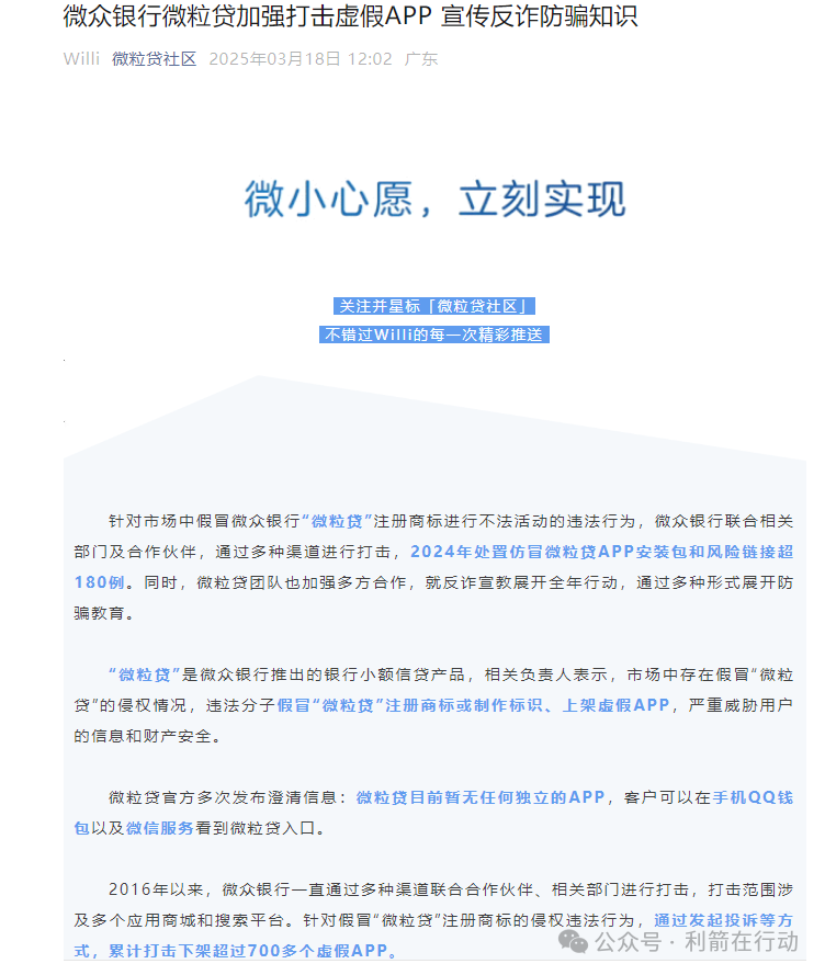 今年3月18日“微粒贷社区”微信公众号发布《微众银行微粒贷加强打击虚假APP 宣传反诈防骗知识》,讲了微粒贷官方多次发布澄清信息:微粒贷目前暂无任何独立的APP,客户可以在手机QQ钱包以及微信服务看到微粒贷入口.......2024年处置仿冒微粒贷APP安装包和风险链接超180例........2016年以来,通过发起投诉等方式,累计打击下架超过700多个虚假APP..............