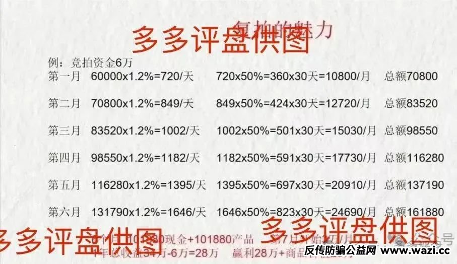 所谓的收益机制,实则是精心编织的 “财富迷局”。平台抛出极具诱惑的噱头:个人参与竞拍,每日就能获取本金 1% 的收益,年化收益率竟超 360%;若加码购入平台推出的 “神秘礼包”,收益率更是攀升至 1.2%。试想,投入 2 万元本金,日进 240 元看似轻松,复利计息的模式更让财富增长充满想象。这般令人血脉偾张的收益数据,恰似暗夜中的磷火,吸引无数投资者蜂拥而入。然而,这场看似稳赚不赔的财富游戏,不过是不法分子设下的 “致命诱惑”,光鲜的收益数字背后,隐藏的是吞噬全部积蓄的无底黑洞。