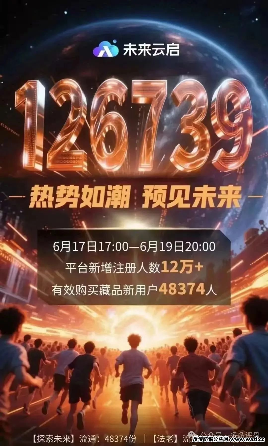 当投资者们为抢到 “限量数字藏品” 欢呼时,他们不会想到,这场精心设计的财富游戏,不过是用虚拟代码编织的收割陷阱。近年来,以 “未来云启” 为代表的资金盘打着数字藏品、链游旗号粉墨登场,与曾引发争议的 “未来起元” 出自同一操盘团队,借监管盲区与新兴概念认知差,悄然张开财富吞噬之网。