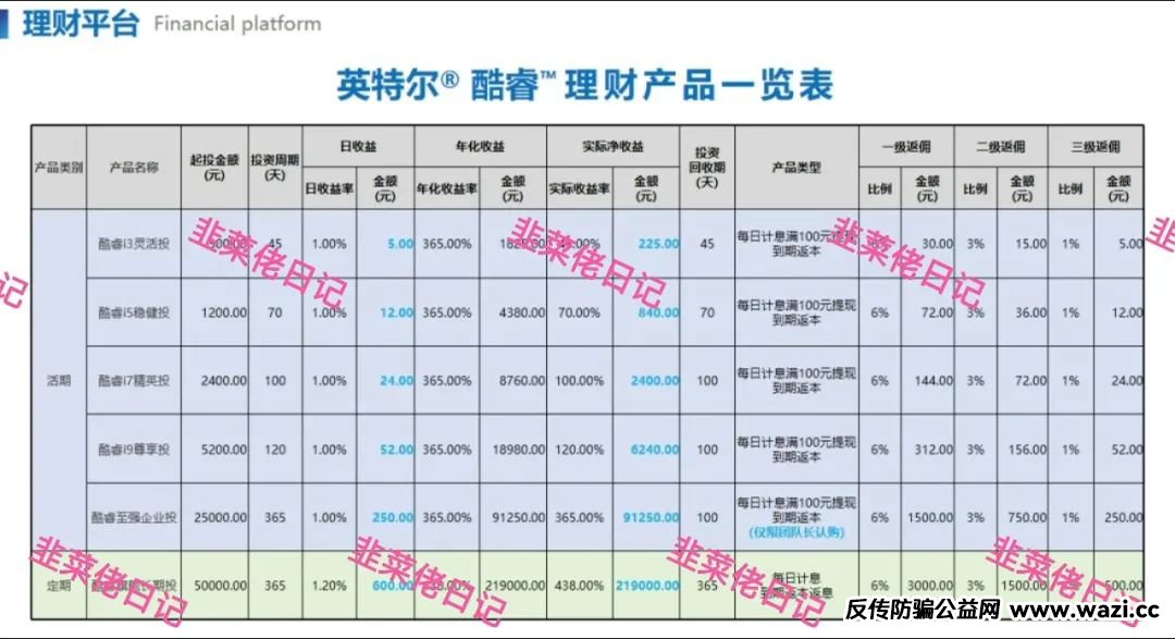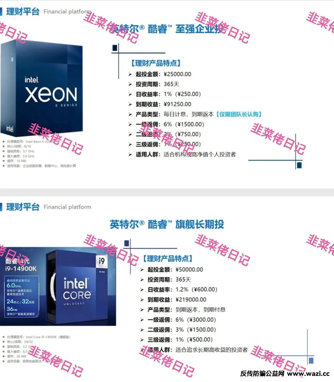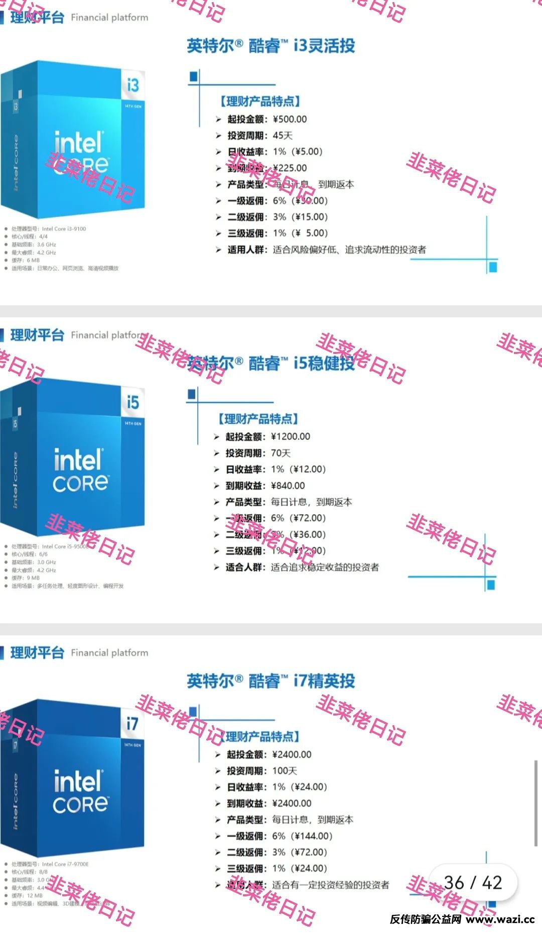 lntel:冒充美国英特尔名义所进行的分红类资金盘诈骗项目。称投资者的资金会注入到酷睿处理器实体产业链,通过参与供应链上下游发展,实现产业驱动与回报双赢,看看就好,资本家怎么可能会让普通人参与到他们的赚钱项目当中,还是只需投资就能参与的这种低门槛,根本不可能的事。产品金额最低500元,最高50000元,50000元产品为1.2%日利率,到期返本返息,其余产品为1%日利率,每日返息,到期返本方式,可享3级收益,1级6%,2级3%,3级1%。