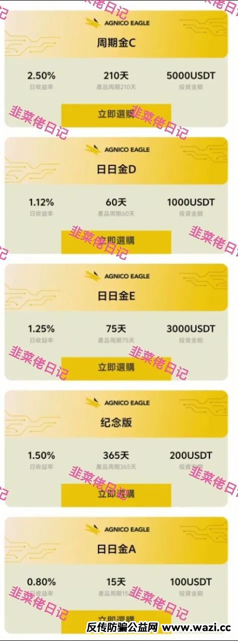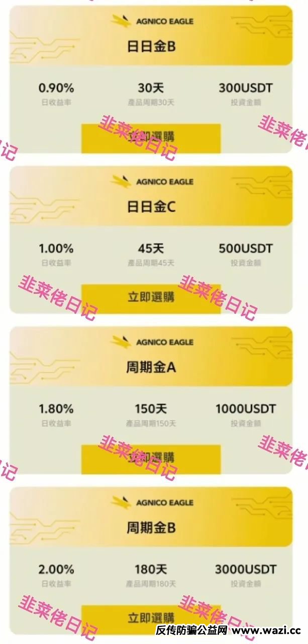 伊格尔矿业:套牌加拿大伊格尔矿业跨国黄金矿业公司名义所进行的分红类资金盘诈骗活动。平台称伊格尔矿业AI量化资金托管采用第四代AI人工智能,结合OpenAI底层逻辑,透过美股和黄金期货进行精准量化。拉人注册赠送15U和平台币,提现要求20U起,想白嫖骗子根本不给机会,至少要购买一份产品才能一起提出。产品金额100U-5000U,日利率0.8%-2.5%,周期有长有短,分为每日返息,到期返本和到期返本返息两种方式,并享有2级收益,1级15%,2级10%。