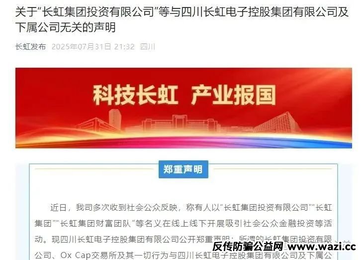 于7月31日晚四川长虹电子控股集团有限公司(下称“长虹控股”)在微信公众号发布打假声明,本质与主体公司不存在有任何关系。