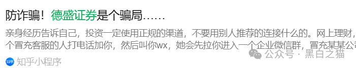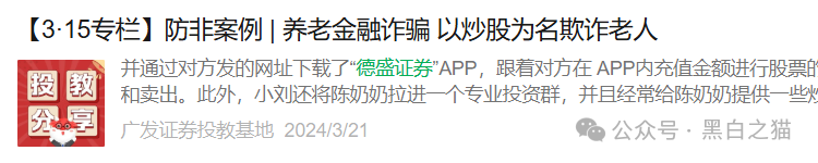 对“德盛证券”历史,小编从微信视频号和知乎上得知是2022年的风靡一时的股票诈骗软件。有官媒出文章进行反诈警示,比如昆明反电信网络诈骗中心、北交所、广发证券官方公众号。