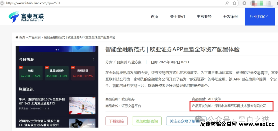 小编放在最后阐述是因为以防有误,经过空间测绘,再三测试确定入链域名备案单位,以及开发制作单位把“欧亚证券”项目当成优秀案例放在自己官网上的事实。