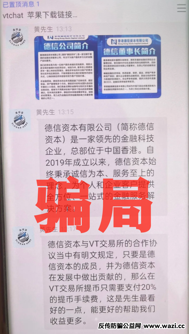 这帮人玩的是平移重启的老把戏,把之前鑫康佳的盘子换个马甲继续骗。最搞笑的是他们编的故事,说什么VT交易所给德信资本会员特殊待遇,提币只要20%手续费。老黄在群里吹得天花乱坠,还搬出个虚构的"邹晓宝董事长",其实就是他自己换了个马甲在演戏。