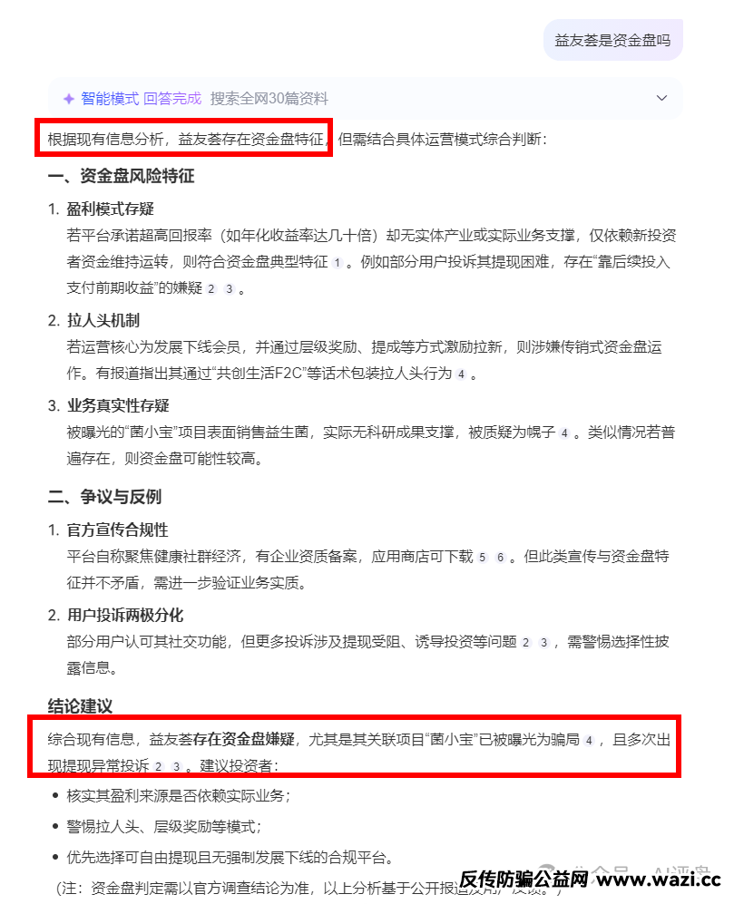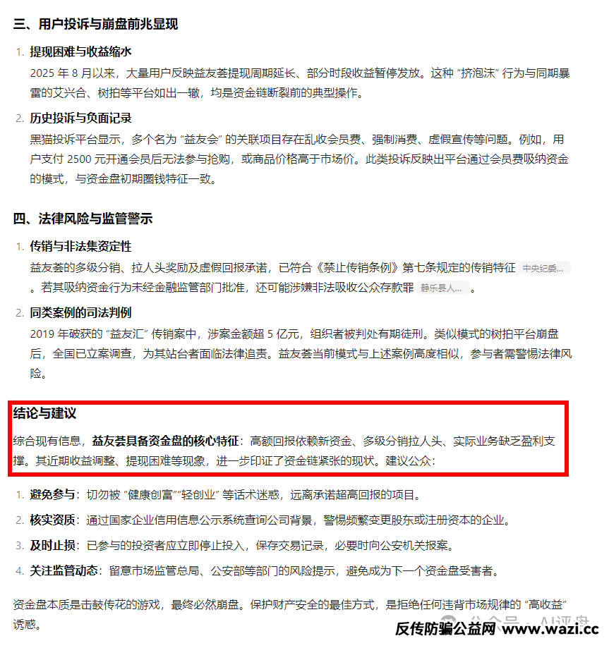 百度AI也分析益友荟存在资金盘特征,并且建议大家警惕拉人头!远离高回报的资金盘!