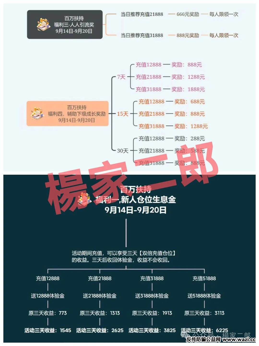 活动大致意思:新人充多少送多少,可参与7-30天翻倍收益,现在月化收益率高达120%,不到一个月回本。并且为了刺激老会员拉新,还设置高额动态奖励,都是赚后面新加入人的钱,不到一个月时间连续搞这种福利活动,判定该平台距离崩盘跑路越来越近,这让博主想到儿时听到过的故事“狼来了”,经常搞这种福利活动来降低参与者的防备心理,从而达到突然收割的真实目的!