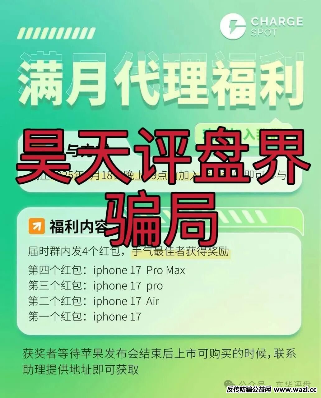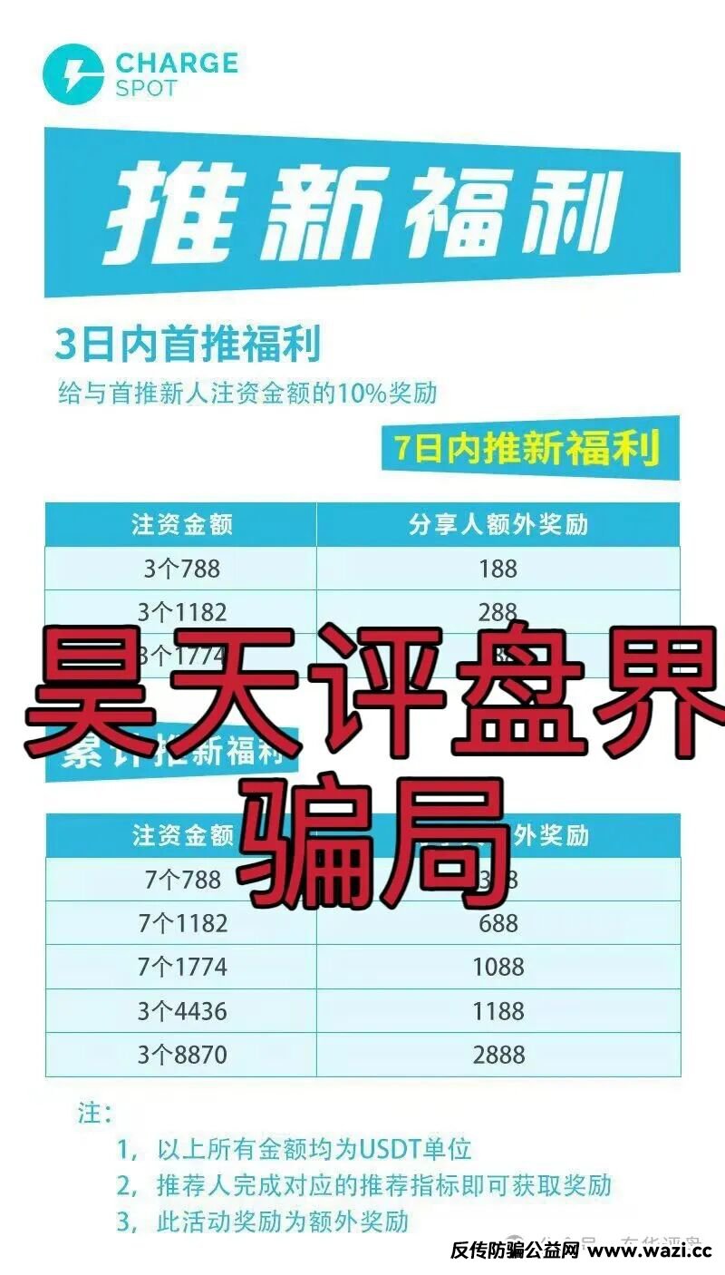 昊天评盘界:近期不少粉丝爆料了一个叫醒电充电宝CHARGE SPOT的资金盘骗局,昊天看了一下资料又一个冒充正规公司的跟单类资金盘骗局,和人家正规公司没有任何关系全是套牌的人家资料,跟人家...