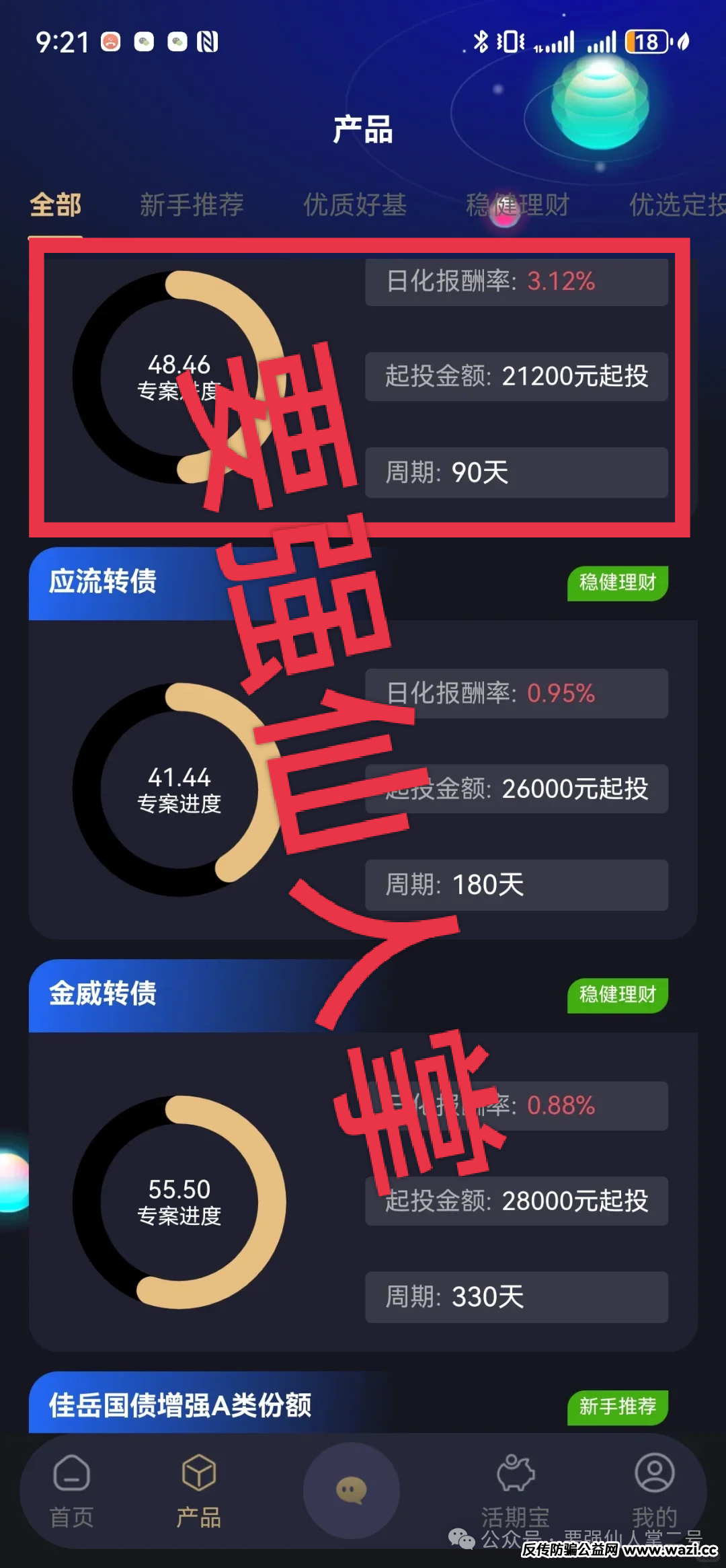 今日曝光一个去年11月份上线的资金盘骗局——“启明创投”,话不多说先上图: “启明创投”的投资产品主要分为五大类别:“新手推荐”、“优质好基”、“稳健理财”、“优选定投”和“高端...