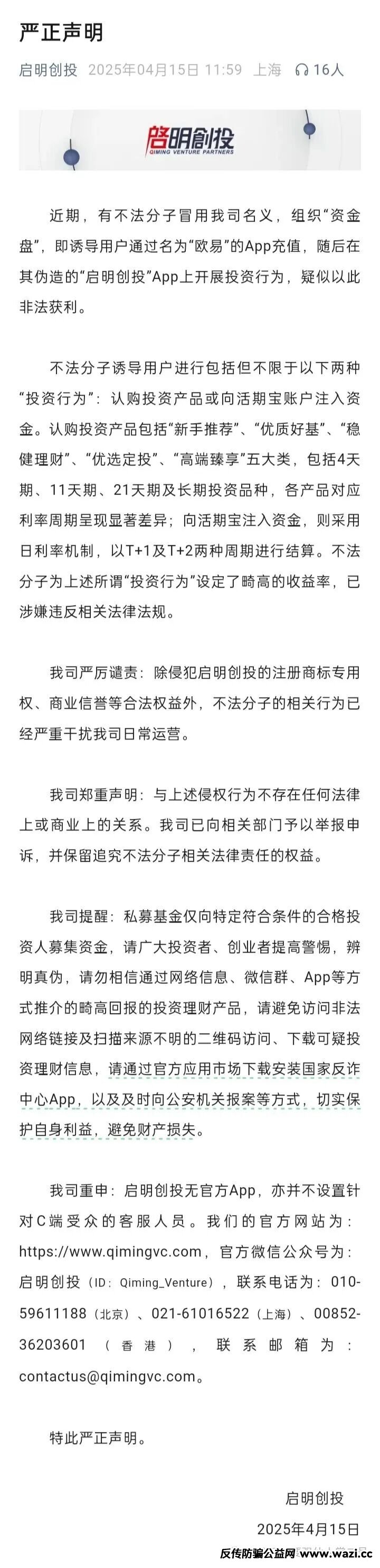 今日曝光一个去年11月份上线的资金盘骗局——“启明创投”,话不多说先上图: