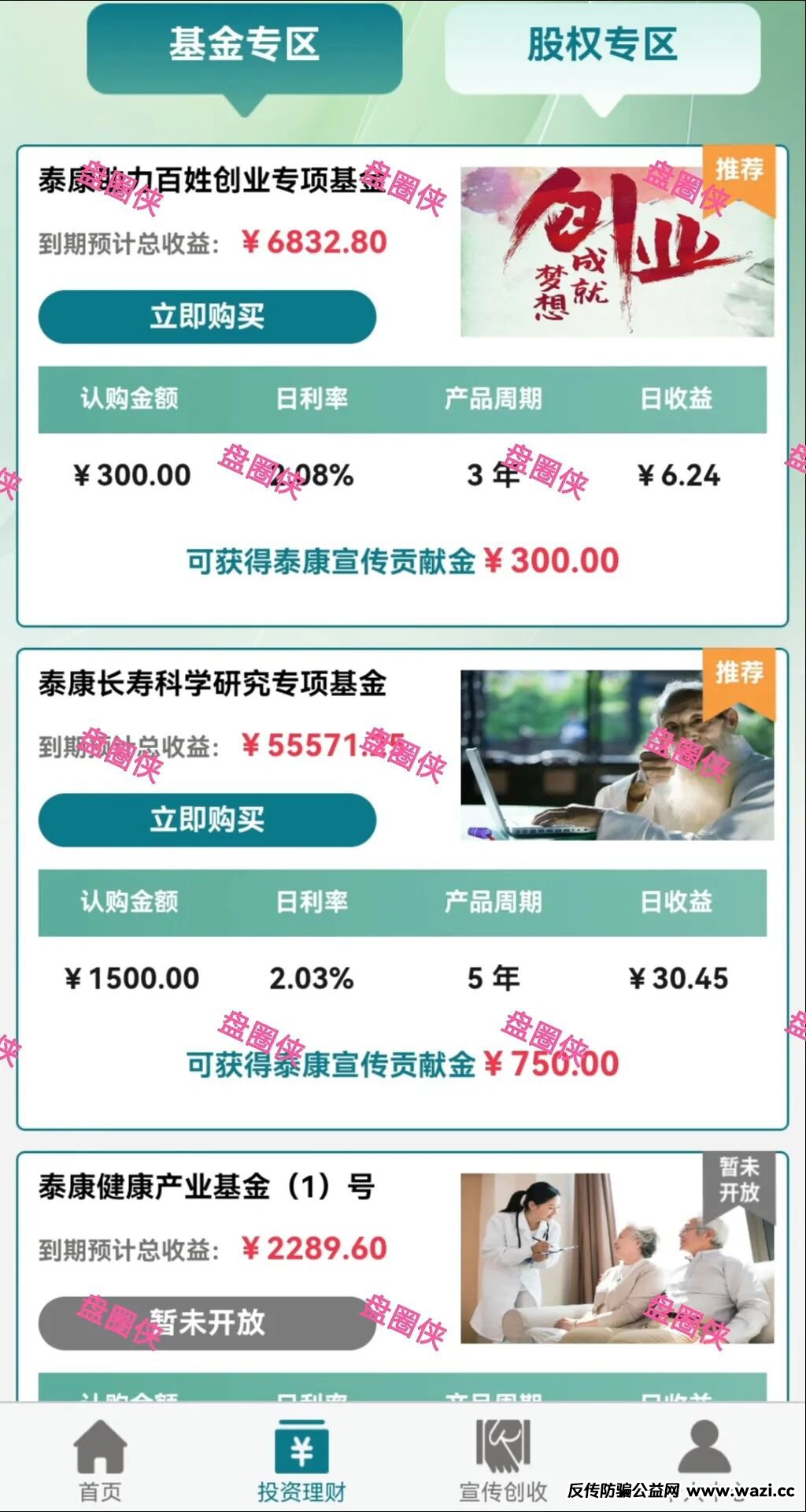 泰康健投:最近上线的分红类资金盘项目骗局,冒充世界500强泰康保险集团旗下子公司用于行骗。注册就需要填写身份证信息,且要求年满30岁以上的中老年人才可参与,每日签到获得50元贡献金额度。