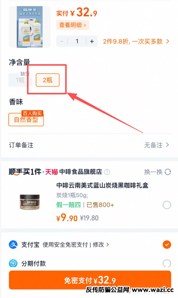 随后推广人员告诉小诺,加入会员后商城商品的售价会降低至会员价。推广人员随后给小诺展示了刚才这款商品的会员价为单瓶9元,算上运费11元,售价也达到了20元。要一次性消费满299元才能享受包邮。并且要加入会员最低需要在商城购买2000元的商品。大家想想20元的价格也要比淘宝的售价高出不少。
