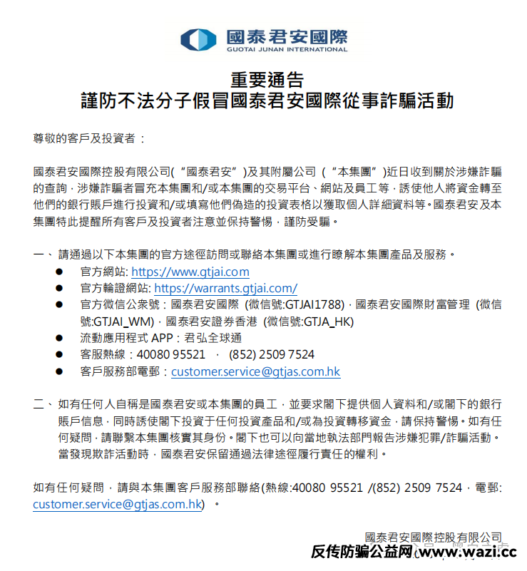 国泰君安证券股份有限公司及其全资子公司,官网域名统一为gtja.(后缀自加,平台不允许宣传外站),所以投资前务必通过证监会官网核查备案信息。