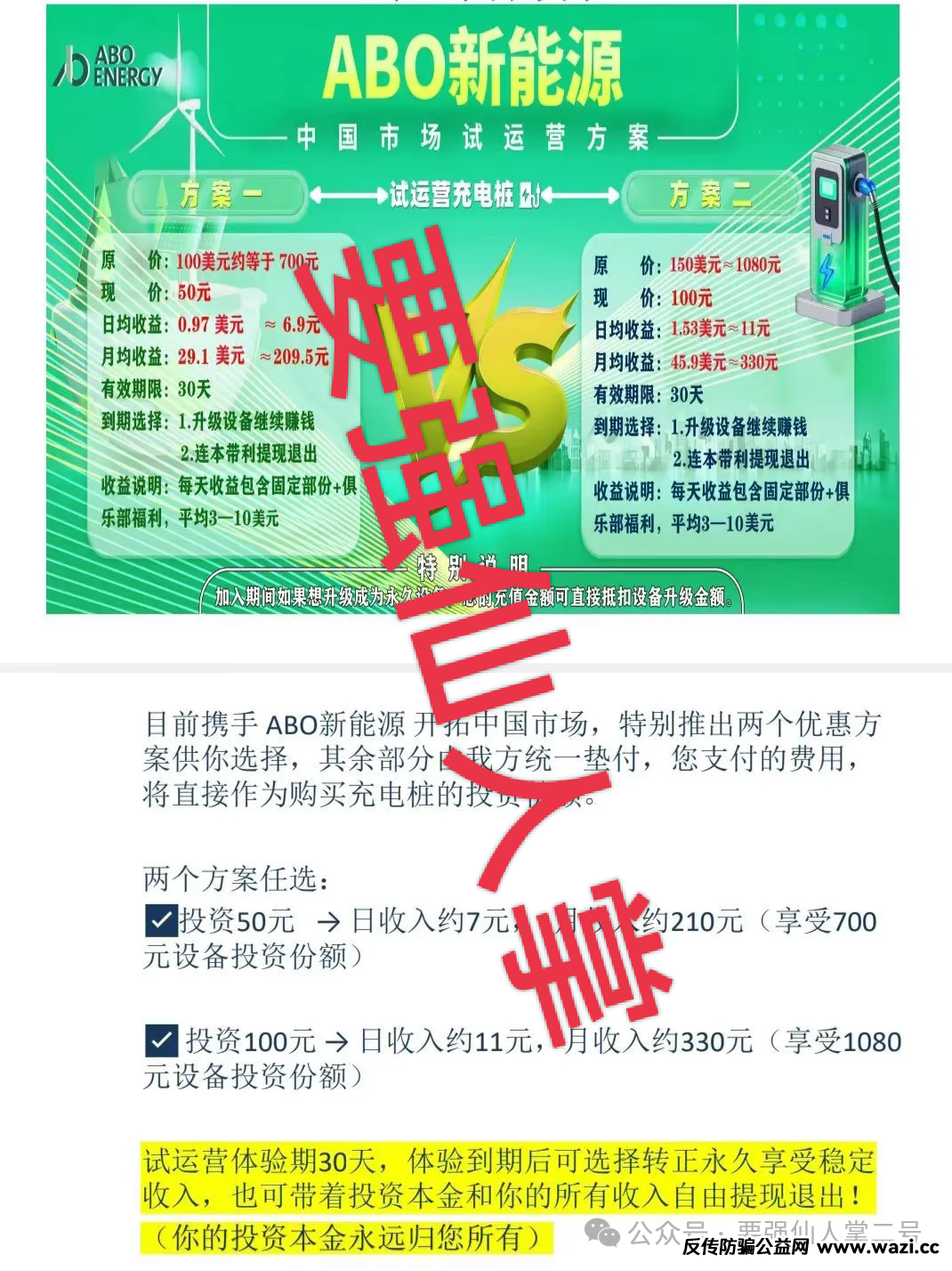 ABO Energy新能源是典型的“套牌诈骗”,冒充正规新能源企业名义,推出“日收益1%左右”的分红类产品,本质是一轮圈韭菜盘。其模式无任何实际业务支撑,全靠新投资者资金支付旧投资者“收益”,属于拆东补西的骗局,当前已进入高度预警期,即将崩盘。