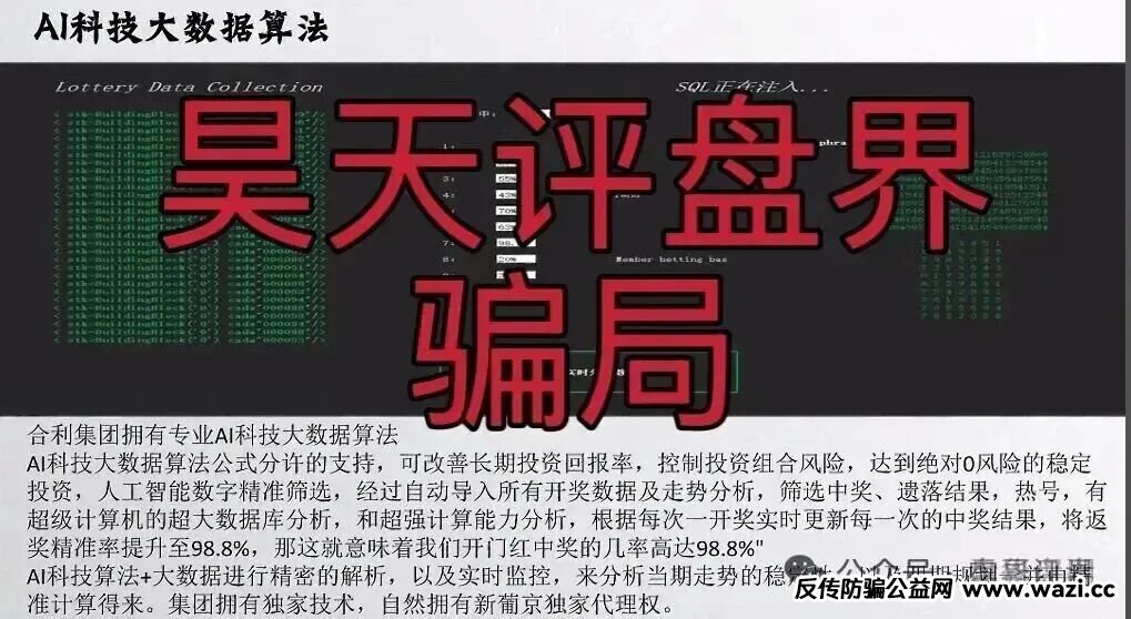 最近震哥又收到粉丝爆料,合利集团搞了个彩票带单的资金盘,老套路了——群里喊你投钱,金额从五千到五万不等,说是用AI大数据算中奖号,吹得天花乱坠,什么“零风险”“98.8%中奖率”,其...