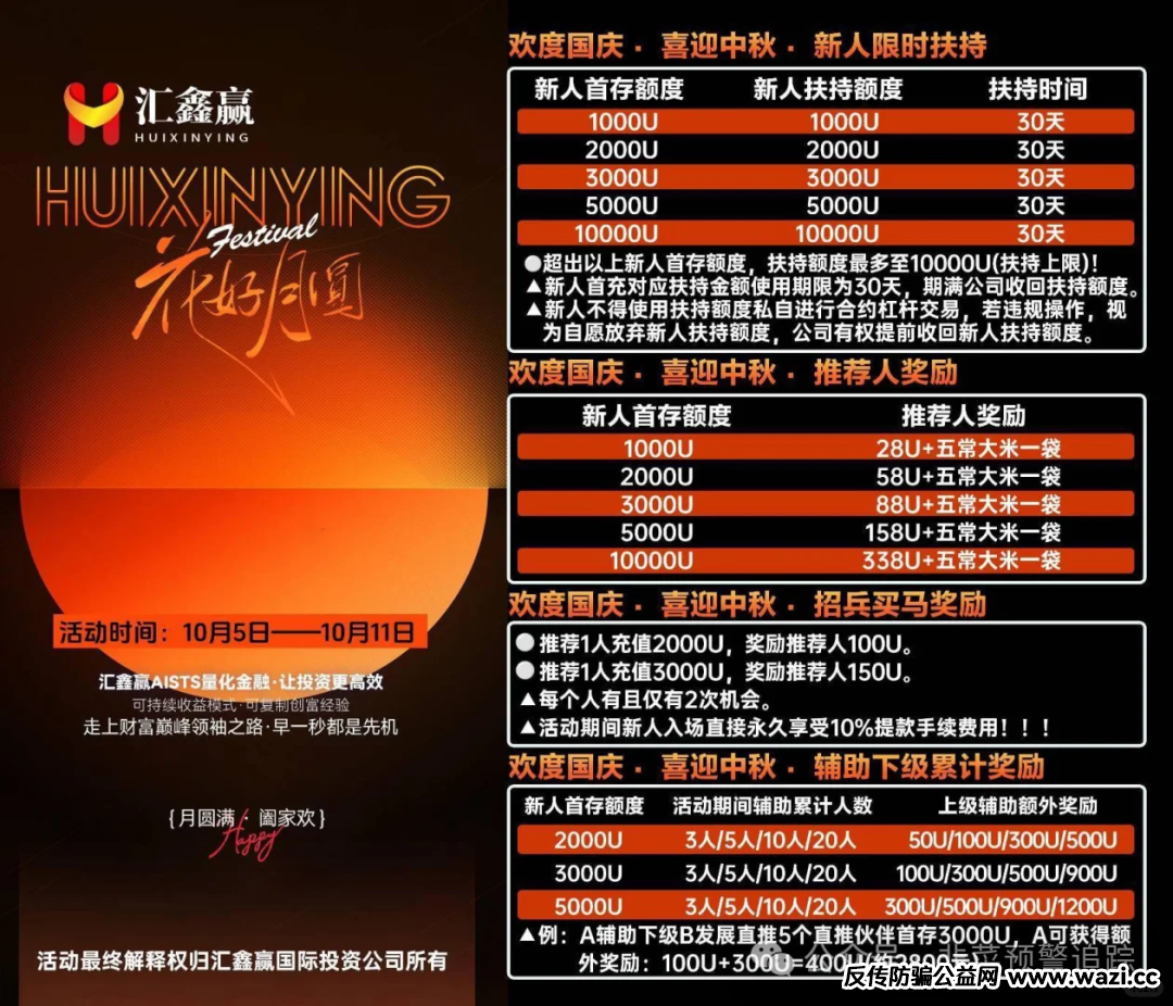 汇鑫赢IG股票期货资金盘已跑路并二次单割。它是泰x宝平移盘,群里“导师”林福胜忽悠补仓,如补500u公司垫500u。其推出新人扶持,首存5000U扶持5000U;推荐奖励,首存10000U推荐人奖338U加米。但资金盘无实际生产投资,钱进骗子口袋。千万别信,守护好财产!