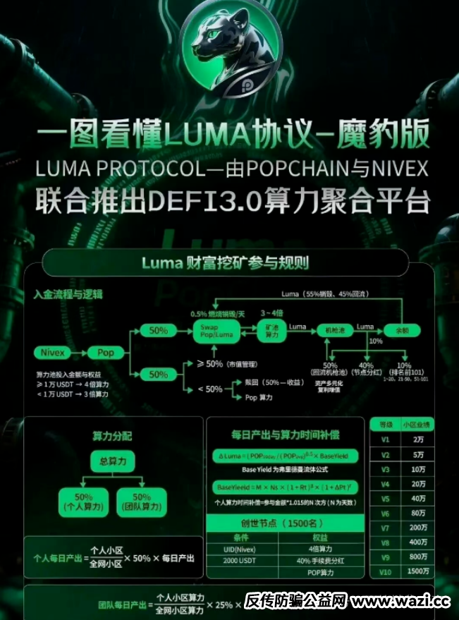 Luma协议自称由PopChain公链 + Nivex交易所联合孵化,号称用“双通缩模型”解决流动性空转问题。但扒开画皮,漏洞百出: