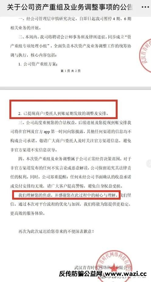 青云租于10月15日发布公告,将以“资产重组”为由延期发放款项。但这根本站不住脚:若为破产重组,财务工作才会冻结;若为常规的企业合并或注资,财务运转理应照常。那么,发放工资和收益为何要暂停?这分明有违商业常识!