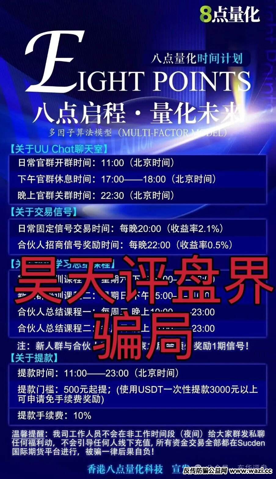 昊天评盘界友情提醒:Sucden期货(八点量化)跟单类资金盘骗局,典型的一轮圈杀猪盘,看见一定要远离!后面会持续关注!近期知乎,小红书,微博,抖音等app都有冒充昊天的诈骗团伙,记住了我们不做项目,更不会去推广任何项目,除公众号外其他一律不是本人,切勿上当受骗!