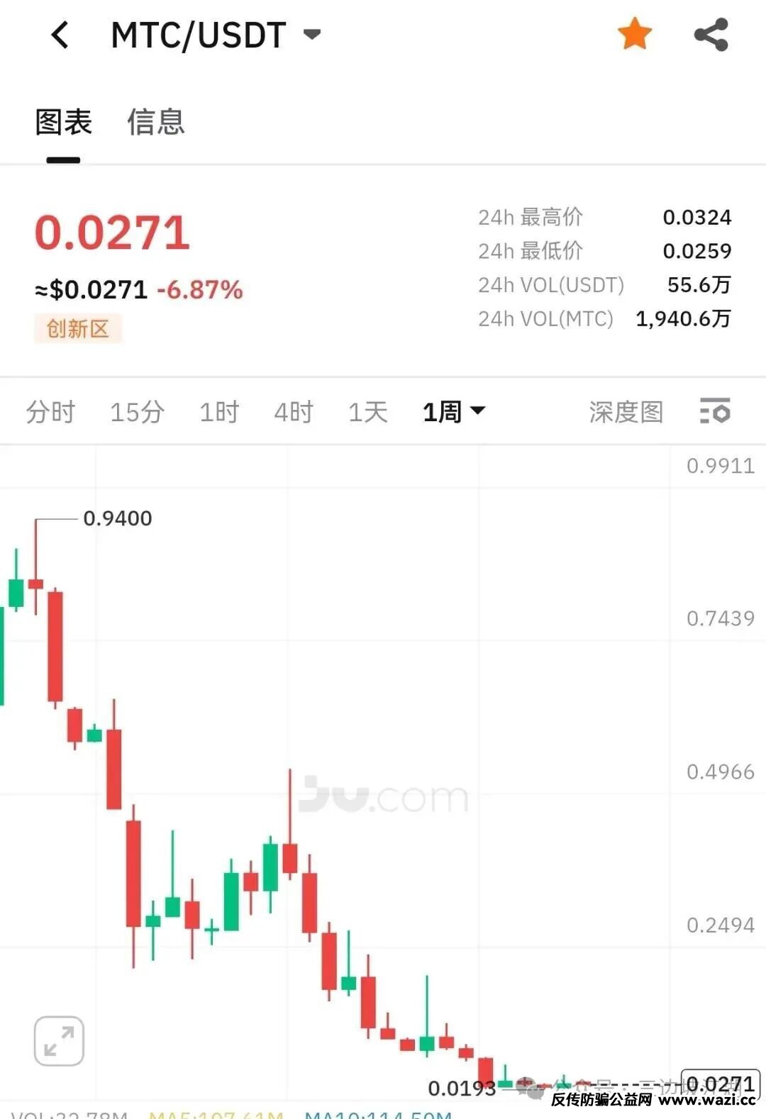 MTC也是聚币的重要项目,价格从高点跌了99.9%,等于归零了。