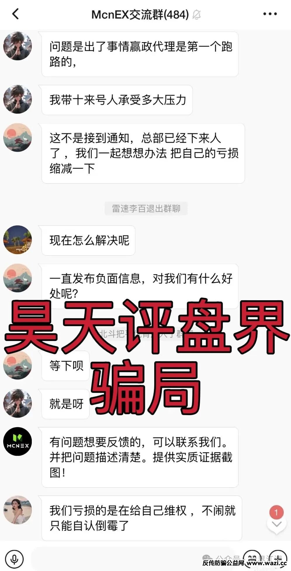 昊天评盘界:MCNEX交易所合约跟单类资金盘骗局,之前昊天就预警过,MCN Global合约的改名重启盘,声称7月10号上线的新盘,以为10月的时候大量割了一次跑路了,没想到最近又出来继续割韭菜了,此骗局每个月都多次爆仓收割会员,而且每次收割都是一个群一个群的割,据知情人爆料团队长和带单导师是合伙的靠吃客损最后37分账,你跟着老师高高兴兴注册了,心里想着等着发大财,做梦都要笑醒,殊不知接下来才是你噩梦的开始。骗子会让你所有资产一次爆仓,瞬间归零。属于典型的杀猪盘,高度预警,即将崩盘跑路!直接上证据: