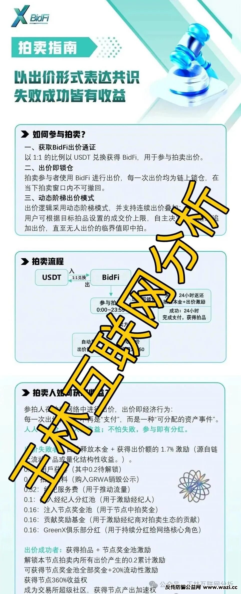 分红类资金盘骗局,声称要打造RWA赛道,分为Ai量化和竞拍Bidfi两个玩法,日化收益0.6-1.3%,还发行了一个GF空气币,总量2100万枚,销毁90%变成210万枚,典型的资金盘骗局!