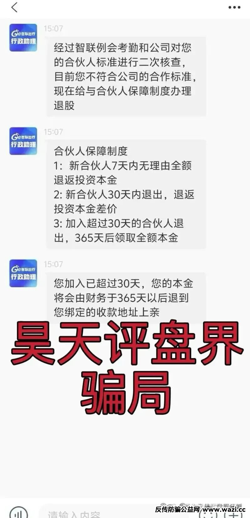 分红类资金盘骗局,昊天也是多次预警和爆料,7万多会员,操盘手圈钱十几亿,目前已经关网跑路了,维权中...