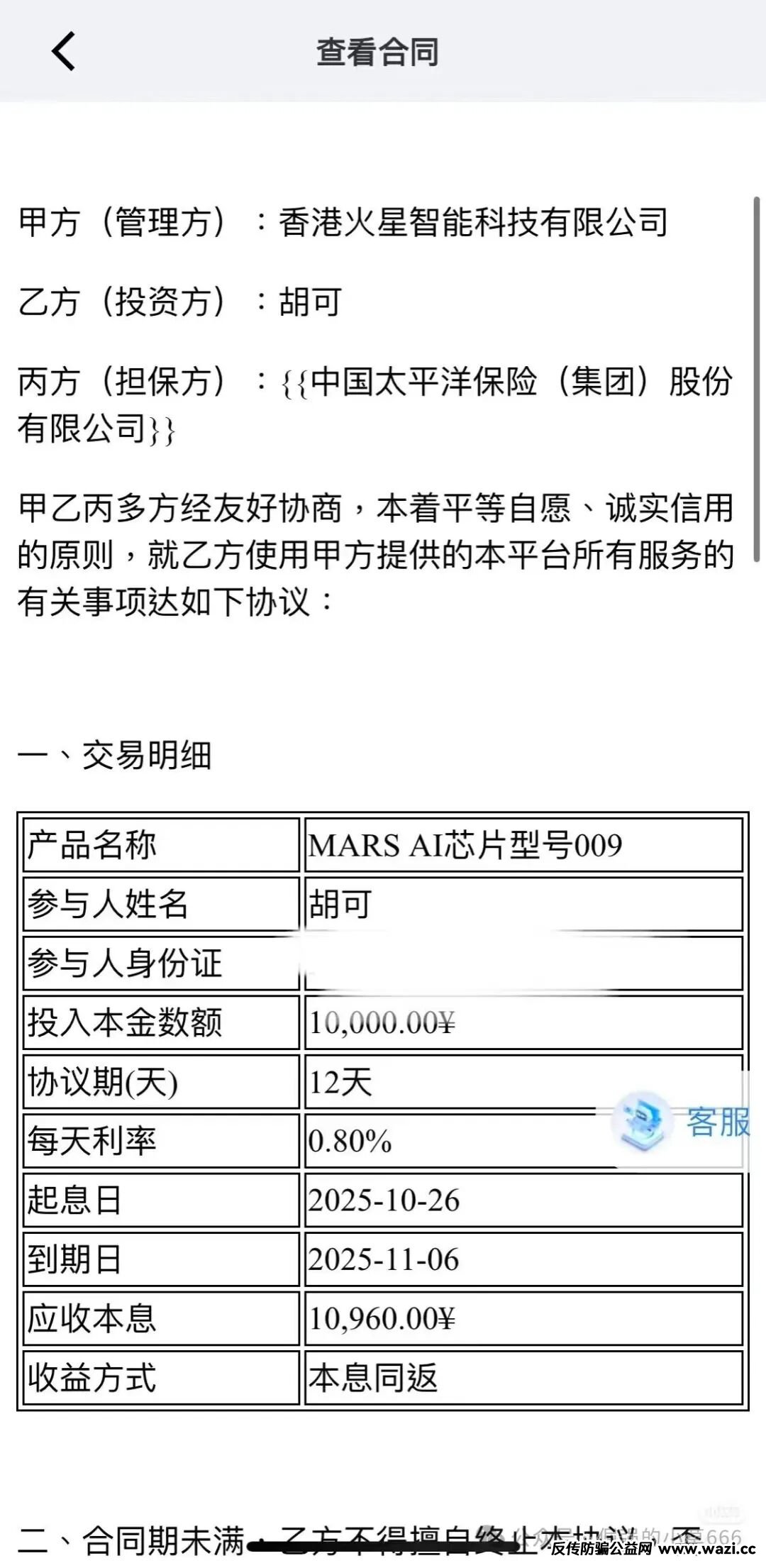 第四,骗子甚至假模假样地与投资者签署电子合同,堂而皇之地将“中国太平洋保险集团”列为承保方。试问,一家实缴资本为零、成立不到半年的空壳公司,凭什么获得国有大型保险机构的背书?真正有点常识的人,只需拨打太平洋保险官方客服电话一问便知真假。这种拙劣的伪造行为,不过是利用普通人对“国企”“保险”字样的天然信任,进一步降低警惕心。