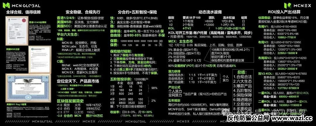 最近一家名为“Mcnex交易所”跟单平台还有赔付保险仓的一个项目,不仅发行自己所谓的MEX平台币,还推出所谓的公链,什么美国香港的金融牌照,全是造假经不起检验和实践,也不知道是花了多少钱买的,估计是冥币吧。