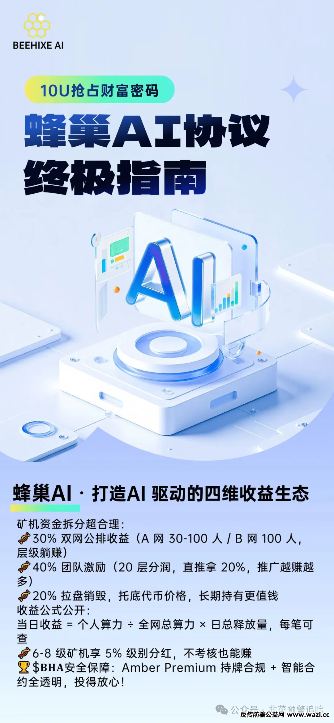 蜂巢AI项目打着10刀起投、实测有收益旗号,以低门槛、新颖模式为诱饵,称有AI优化、币安链保障。然而,所谓双网公排、算力挖矿类似传销,AI很可能是噱头。新颖模式背后隐藏巨大风险,“普惠金融”或许只是迷惑手段。投资不能只看表象,大家务必保持高度警惕,切勿盲目投入,谨防落入资金盘陷阱!