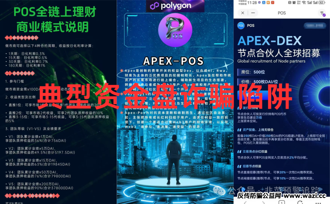 POS项目风险重重,静态收益给出极不常见的固定高日化利率,难以为继。动态收益靠拉人头,直推人数和团队业绩决定收益,有明显传销特征。续费手续费或为项目方获利手段。APEX-POS愿景缺乏验证成果,应用场景落地存疑。节点合伙人招募虽有分红等权益,但交易流水真实性、可持续性难保证,还强化拉人头模式。此项目是资金盘,新参与者减少易致资金链断裂,崩盘风险高,切勿参与。