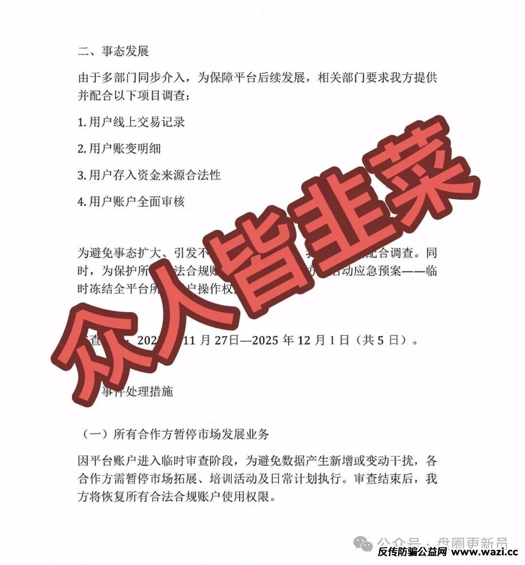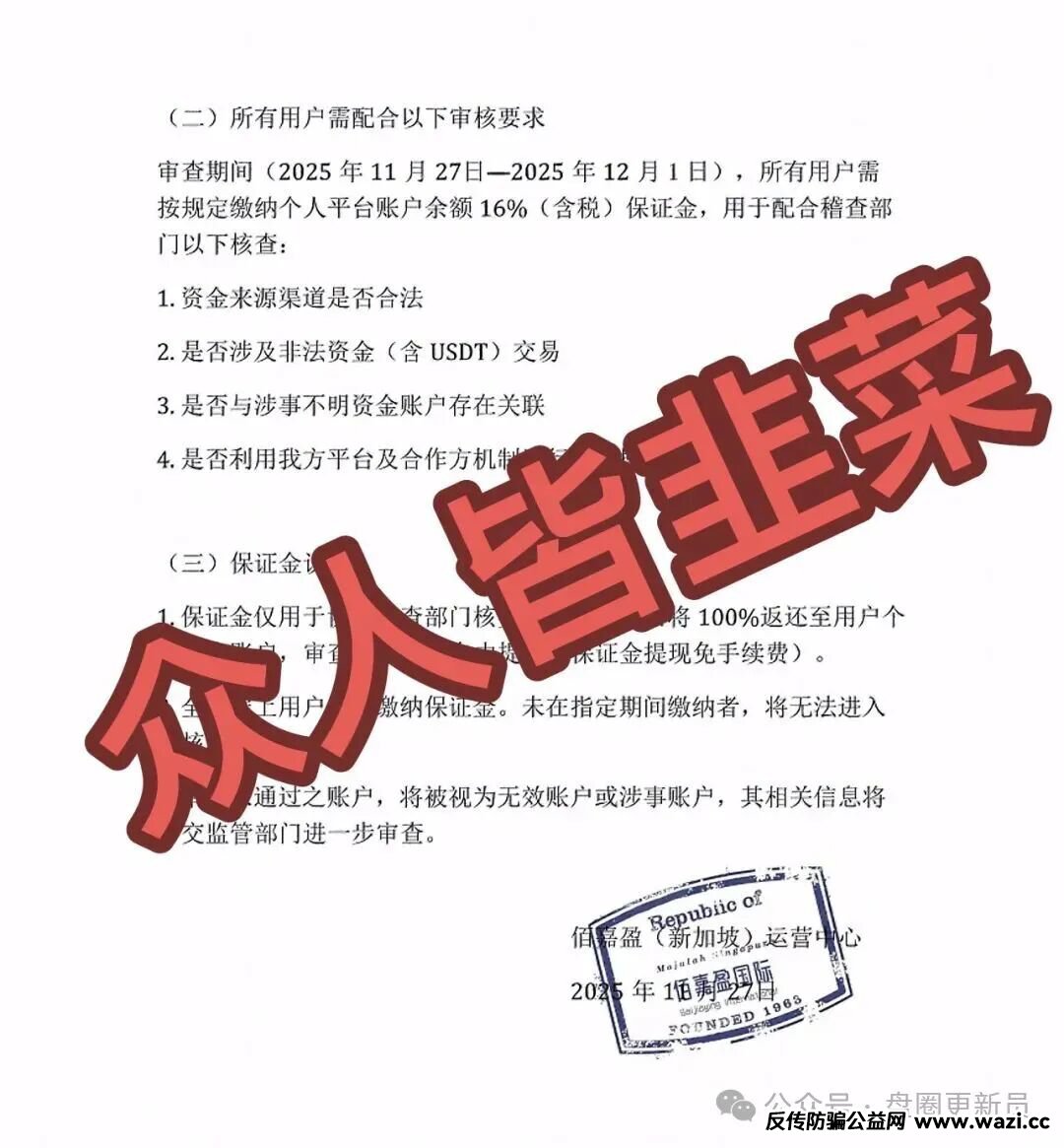 平台已经发跑路公告,声称有不明资金涌入平台,要接受五天的审查,审查期间所有用户要缴纳平台账户余额的百分之16,看到这里应该都知道骗子想干什么了,这是跑路之前最后收割一波,据说在之前就已经出现提现不到账退回账户的问题,很明显就是为了锁仓收割,千万别再充值!