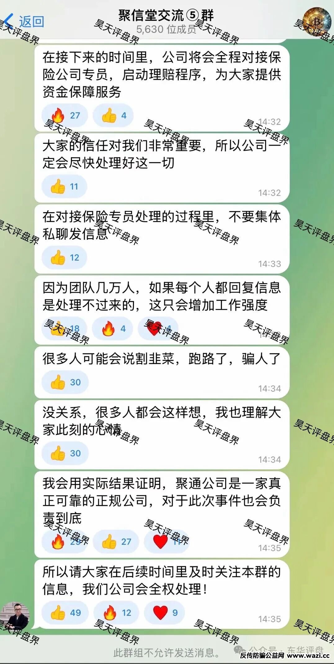 昊天评盘界友情提醒:聚通交易所合约跟单类资金盘骗局,已经彻底崩盘了,操盘手李睿信还在群里忽悠什么有保险包赔,后面就是二次收割,各位注意,速度报警维权吧!后面会持续关注!近期知乎,小红书,微博,抖音等app都有冒充昊天的诈骗团伙,记住了我们不做项目,更不会去推广任何项目,除公众号外其他一律不是本人,切勿上当受骗!