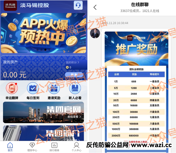 诈骗“淡马锡控股”APP是在11.7日上线,经过核心团队长在各类群推广,距今不到一个月。从高佣奖励、团队业绩奖励的力度,还有层次表现是典型的传销资金盘。