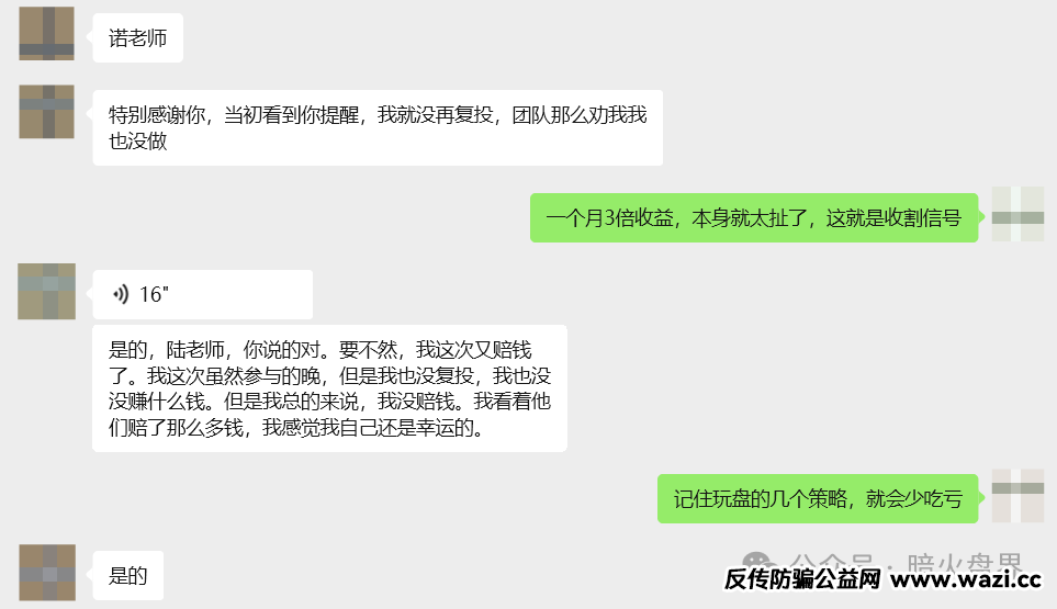还有人竟然还在相信,什么聚鑫汇团队会保证在操盘手收割之前提醒大家下车的谎言。小诺上一篇文章就已经说过了,操盘手是根据资金池内的资金流转量来决定什么时候收割的,怎么可能会按照硬性的周期?更加不可能将收割的消息告诉给市场中的任何人。相信聚鑫汇这个组织如果真实存在的话,也是最上层的个别领导人会预测到收割日期,悄悄的下车了,绝不可能在微信群里大肆宣扬。