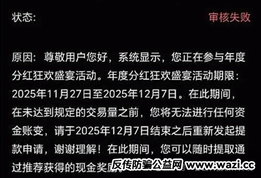 更令人担忧的是,平台一边限制提现,一边鼓励用户继续充值,并以“完成交易量即可解锁提现权限”“充值返利”等话术诱导用户追加投入。此类操作模式高度符合非法集资和资金盘的典型特征。