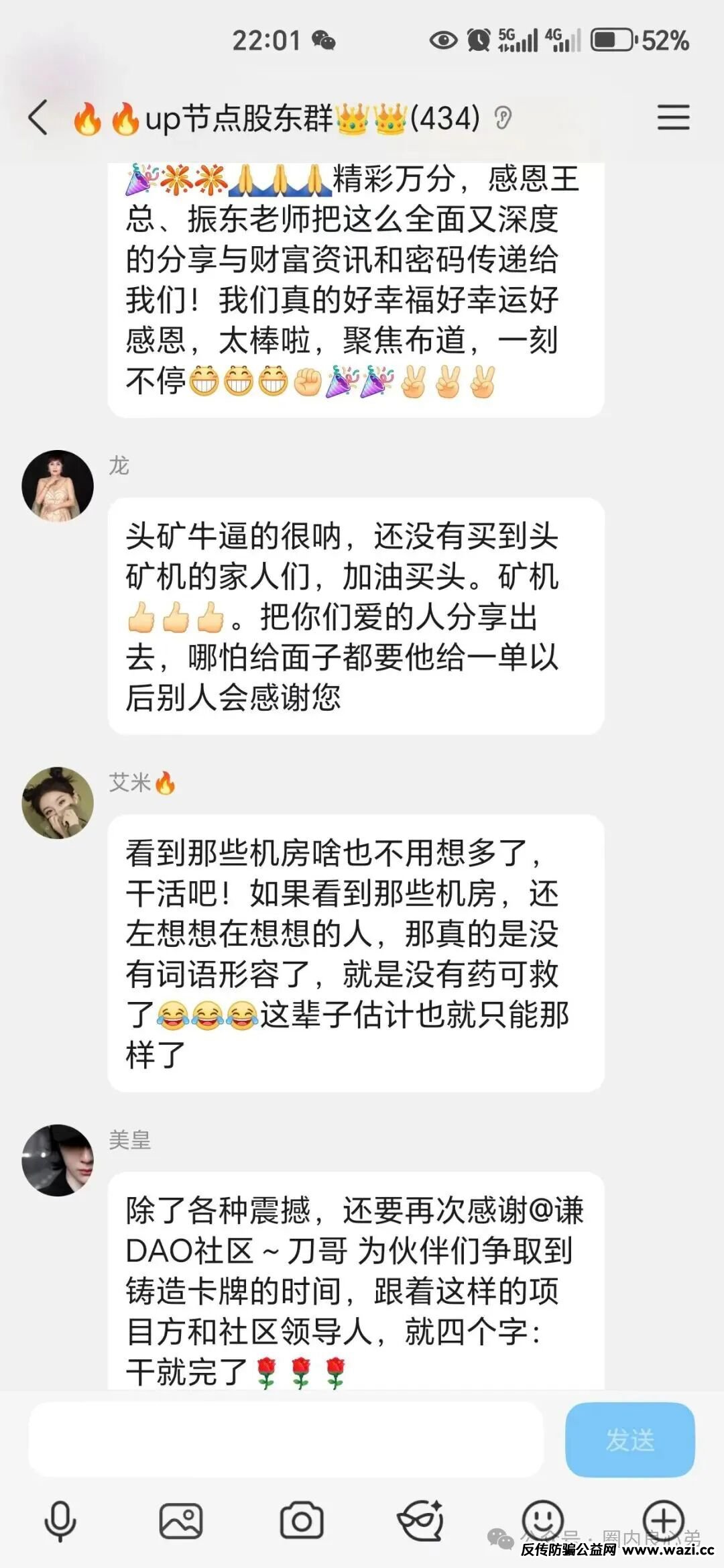 看着下面这个社区团队长洗脑话术,涨100U一枚,不说100U,很多投资9U进厂质押挖币,1000U去质押,如今UP代币0.8u价值80U,先不说赚多少钱吧,现在很多只想回本,估摸着回本无望了,毕竟黑心钱赚多少,这些团队长也能安稳睡大觉。
