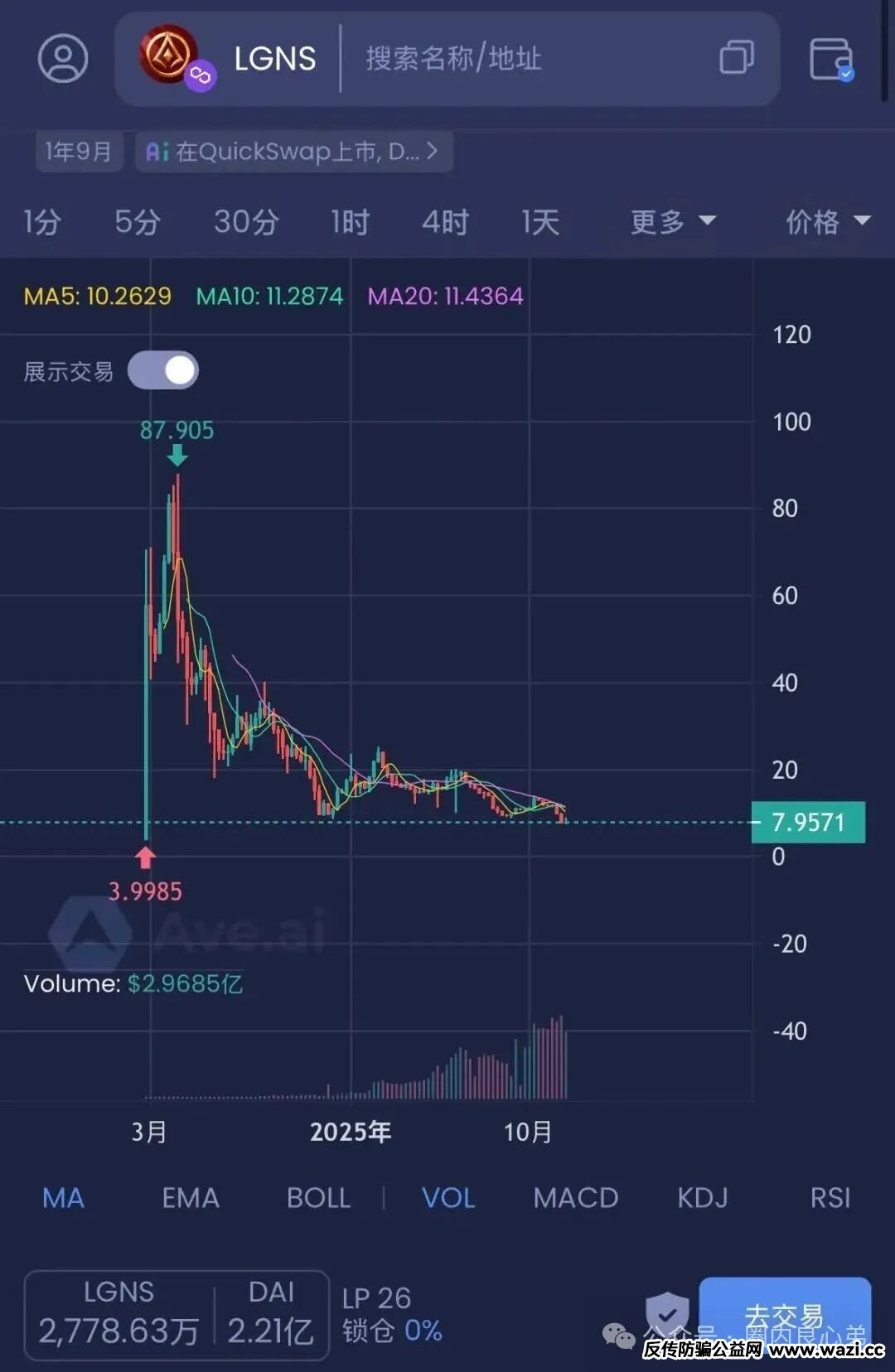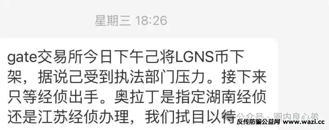 奥拉丁起源的LGNS近日被币安钱包和gate钱包下架了,网传说是被国内警方要求下架的。其实国内早就有地方公安在调查了,这么一个全国各地参与人数上百万人、涉及资金几百亿的虚拟币资金盘骗局,公安不查才怪呢。即使没有政府的介入,这个奥拉丁本身泡沫也是到了一个恐怖的阶段了,看看最近币价都一路跌到7刀了。