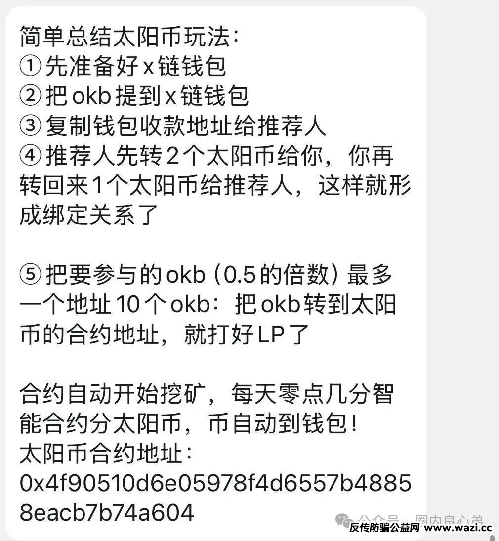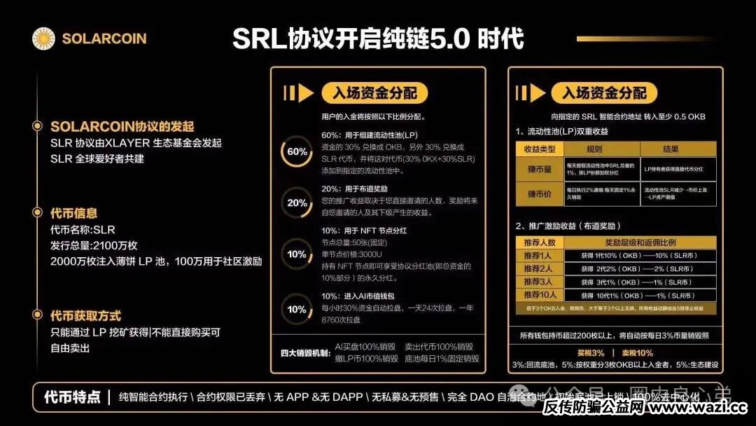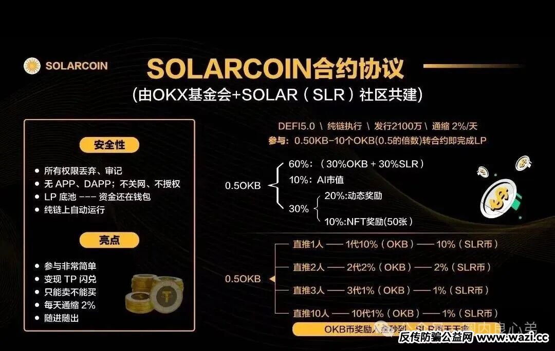 也是一个链上协议,打着去中心化伪概念,在币安链开发的dapp,对外宣称月投资回报率在30%,就是一个刺刺裸裸诈骗盘,毫无技术可言,多拉人头可以分更多的资金,就是一个分钱的游戏。