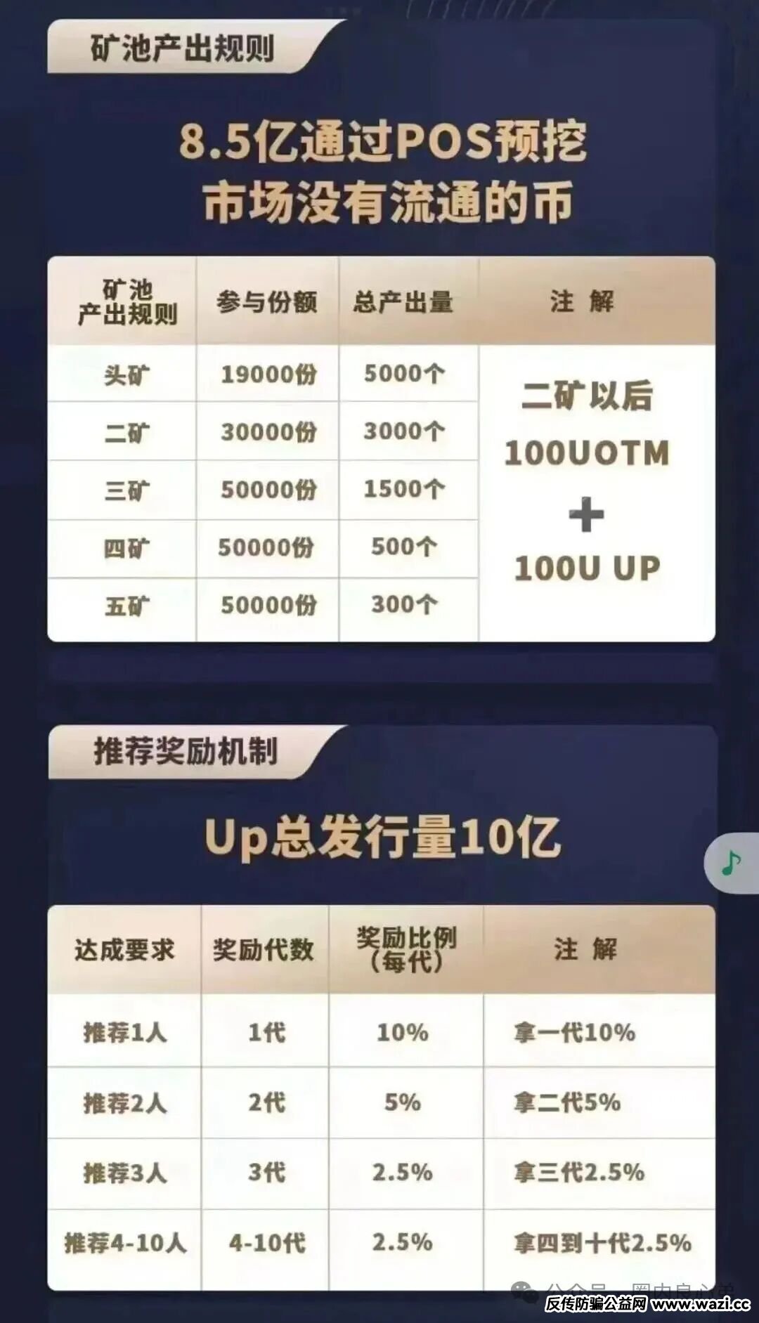 UP也就是打着高收益的幌子,质押100个UP年华收益能达到惊人的50%,按照他们画饼的计算现在投280刀,一年后能赚45000刀,做团队社区的更是厉害了,最高拿到10代,中国法律最高给超过3代,你这是在挑战法律的底线,高收益,拉人头高返佣,这是一个合格的公链应该做的事?这不明白着是ZJ盘。