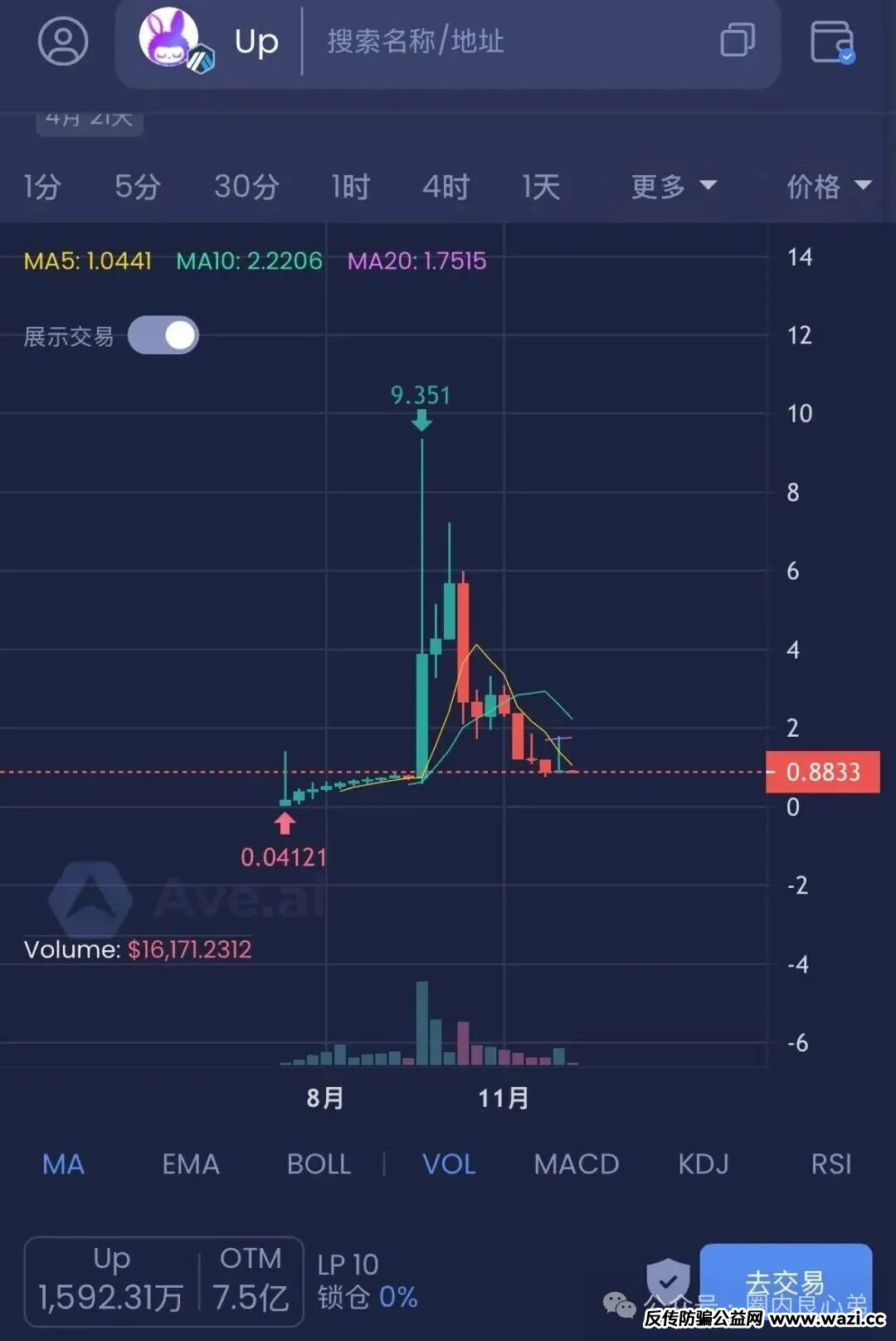 这个虚拟币类的资金盘骗局模式跟拉菲协议差不多的,也是金本位模式,大概就是投资多少U,每天给你1%左右的利息收益。近日也开始出事了,币价暴跌,底池所剩无几,估计快要崩盘跑路了,上线时间为期三个月,崩盘也在一瞬间的事。