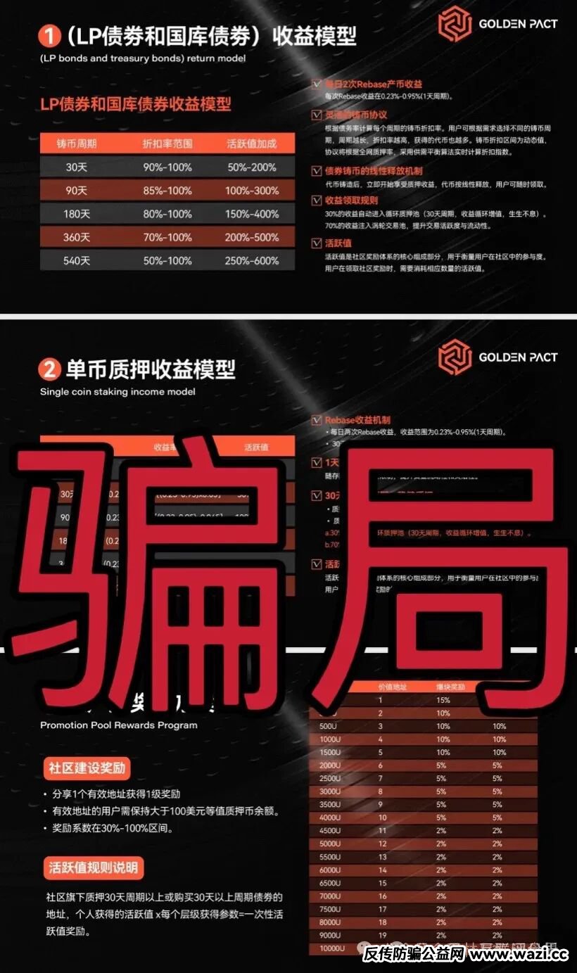 “黄金协议”(Golden Pact)质押类分红资金盘骗局,据知情人爆料此盘开盘一个月,目前已经有6万左右会员,并且和“奥拉丁Orgin”,“webkey”这三个盘是同一个操盘手,目前这个诈骗团伙已经圈钱几十亿了,由于“奥拉丁”大团队已经撤离,快要崩盘了,才开的另外2个盘,高度预警,而他们开的“奥拉丁”也是即将收割!
