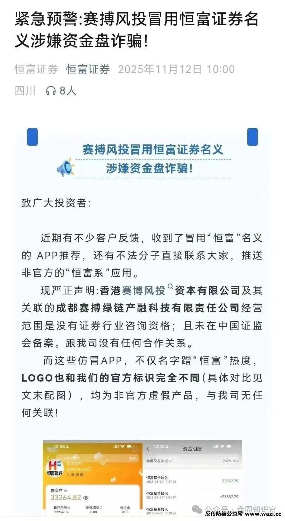 当 “45 天回本”“日息最高 10%” 的投资承诺摆在面前,你是否会心动?近期,名为 “赛搏风投”(冒用 “恒富证券” 名义)的股票带单类资金盘骗局正式崩盘,数亿资金被套,超 7 万名投资者从 “暴富梦” 跌入 “维权难” 的现实深渊,这场精心设计的骗局,再次给所有投资者敲响了警钟。