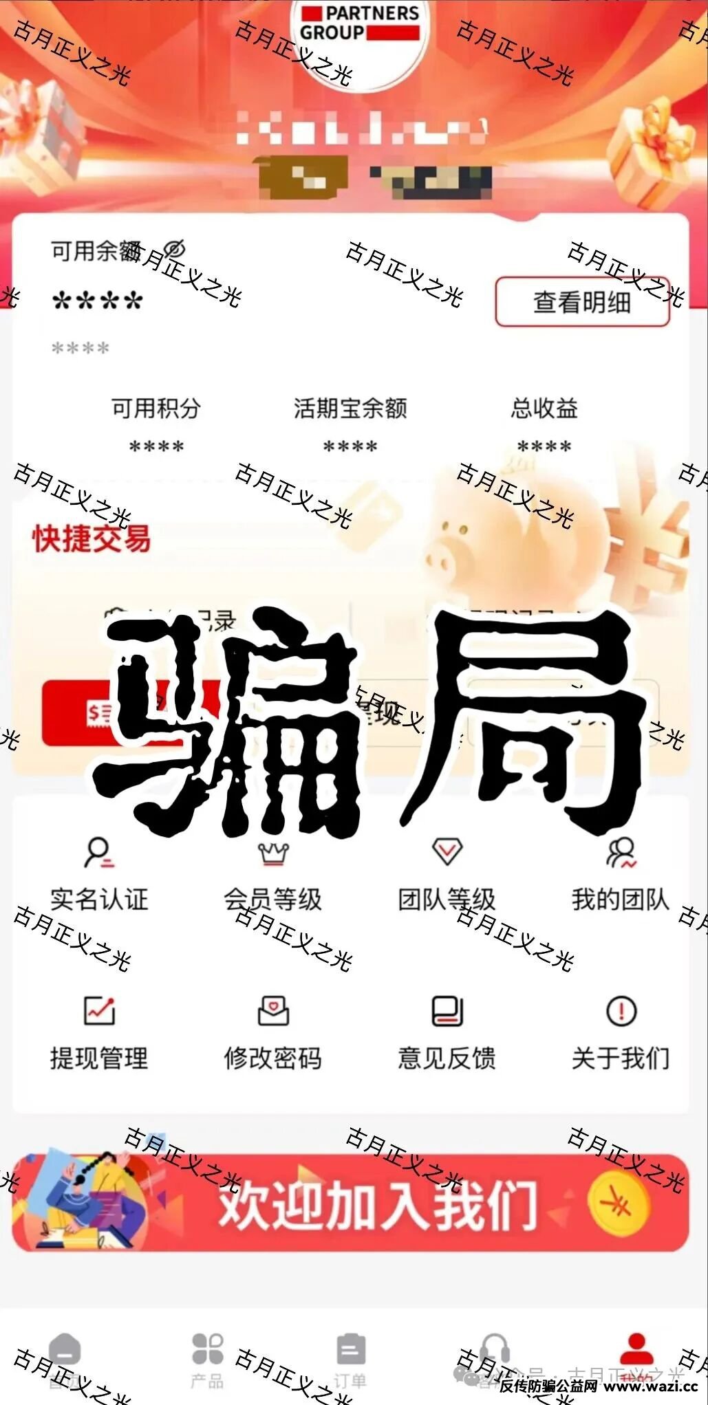 套牌的“PARTNERS(合众)”APP,冒用“合众集团”名义,兜售日收益率远超市场水平的虚假理财产品,即将收割跑路!...