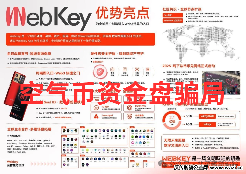 WebkeyDao打着区块链旗号行骗,一年吸引全球大几十万人投资。它宣传是多链聚合型Web3手机。其WkeyDAO代币质押收益高得离谱,靠12级推荐奖励拉人,是拉人头式传销骗局。推出理财和各类拉人头补贴,一旦项目方跑路它也会归零,无任何实际项目支撑。投资要理性,别沦为韭菜!
