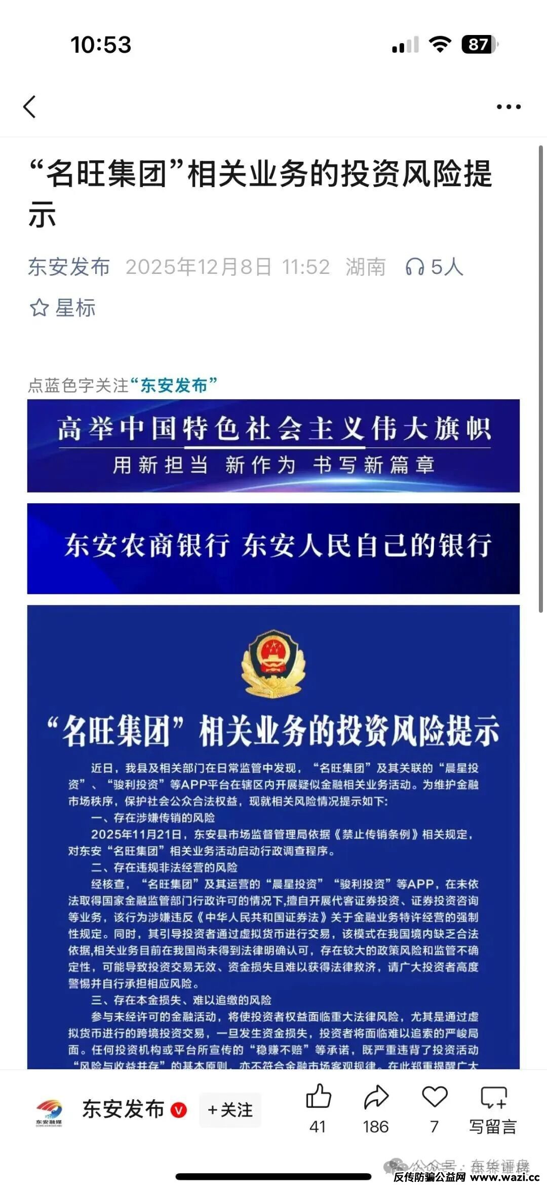 对于此骗局东安县公安局也发布了关于此盘的相关业务的投资风险提示如下,文中明确指出经核查,“名旺集团”及其运营的“晨星投资”“骏利投资”等APP,在未依法取得国家金融监管部门行政许可的情况下,擅自开展代客证券投资、证券投资咨询等业务,该行为涉嫌违反《中华人民共和国证券法》关于金融业务特许经营的强制性规定。