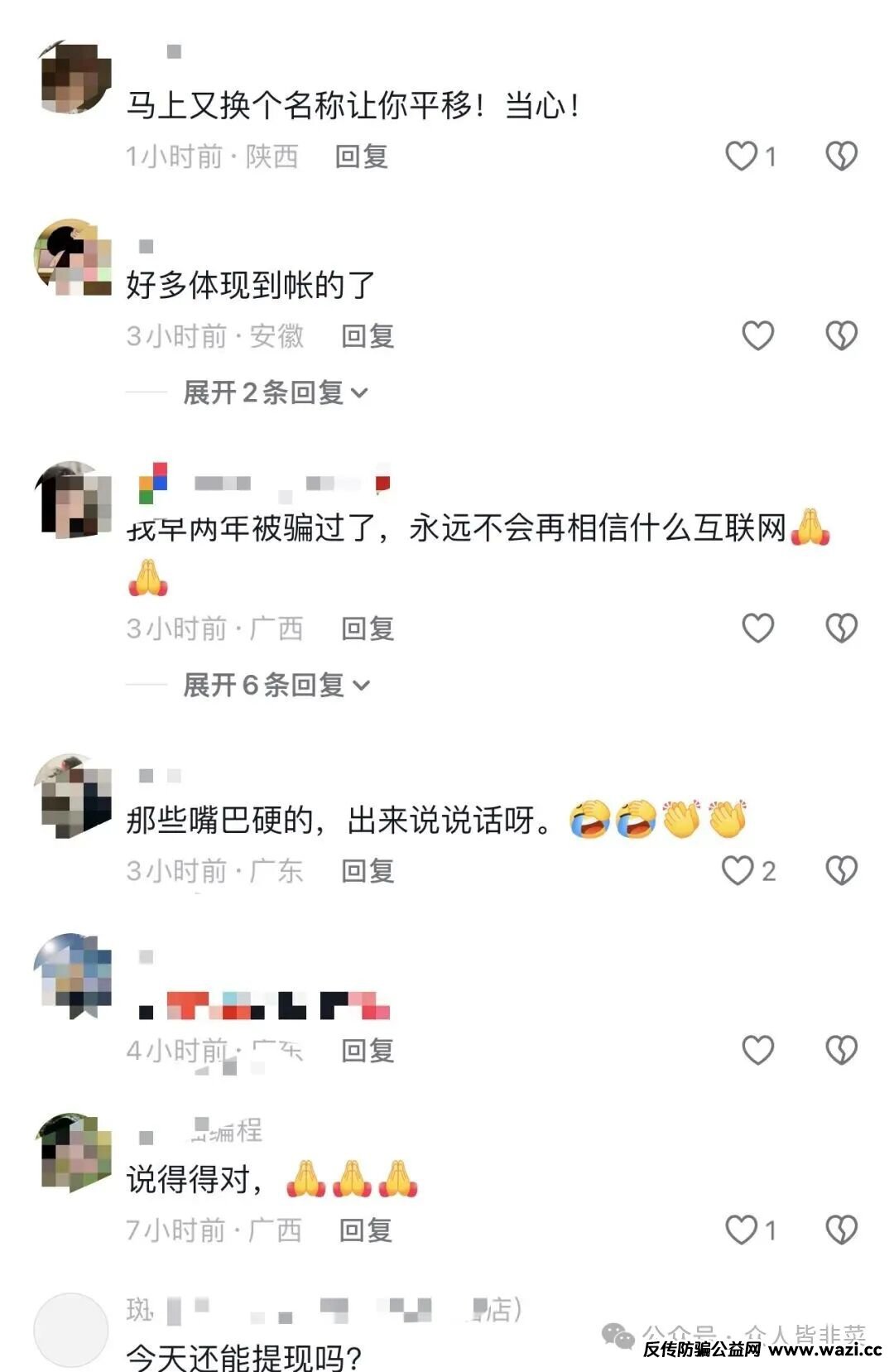 有些诈骗项目一直存在,是因为一直能骗到人,特别是那些无脑韭菜,充进去那么多钱,看不见回头钱,依然选择等待结果,你以为这种已经很无脑了?还有一些已经跑路好几年的骗局,还能被骗子以及团队长忽悠,不是今天好消息,就是明天确定发钱了,一直活在别人嘴里.......