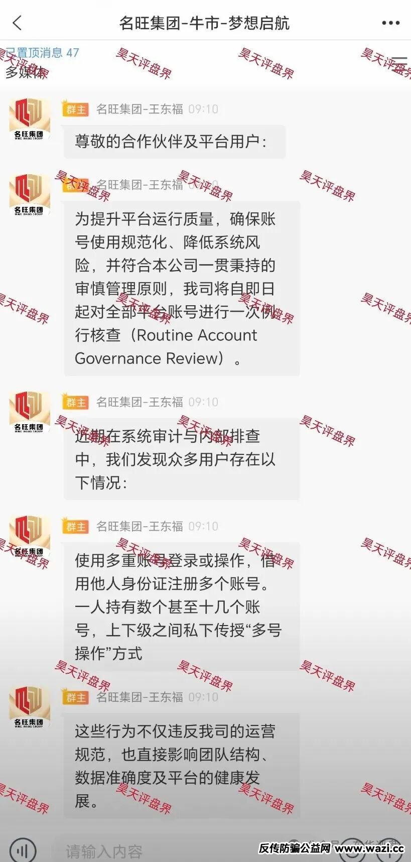 昊天评盘界:名旺集团股票跟单类资金盘骗局,也叫骏利投资,晨星投资,这个盘昊天之前也是预警过2次,据受害者爆料今天彻底崩盘跑路了,诈骗团伙让受害者缴纳8%验证金继续二次收割,已经被调查中,千万别交!老王给出的崩盘理由还是老套路:尊敬的合作伙伴及平台用户:为提升平台运行质量,确保账号使用规范化、降低系统风险,并符合本公司一贯秉持的审慎管理原则,我司将自即日起对全部平台账号进行一次例行核查(Routine AccountGovernance Review)。近期在系统审计与内部排查中,我们发现众多用户存在以下情况:使用多重账号登录或操作,借用他人身份证注册多个账号。一人持有数个甚至十几个账号,上下级之间私下传授“多号操作”方式这些行为不仅违反我司的运营规范,也直接影响团队结构、数据准确度及平台的健康发展。因此,经我司研究决定:即日起启动全平台统一账号治理,严格核查并规范所有账号使用。整顿重点包括:重复注册账号,多设备频繁登录且行为异常的账号,长期不活跃或资料不完整的账号,不符合规范的多号行为,核查流程将由助理与所有成员逐一确认,我们会秉承,公开、公平、合规、透明的原则。这崩盘理由是不是很熟悉?是的,全是一个骗局套路: