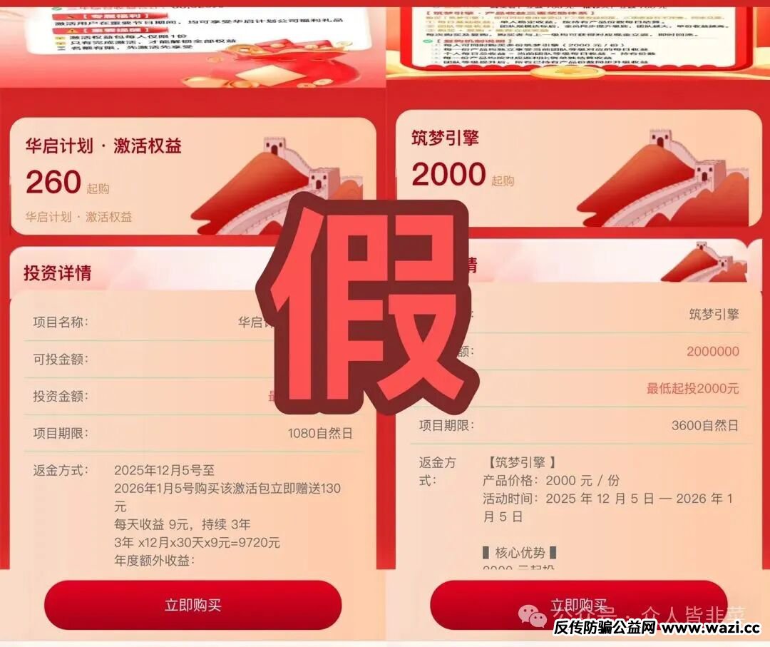 华启计划骗局,又是这种冒充国家项目的诈骗资金盘,诈骗手段低劣,随便注册账户都能成功,目前出了两款投资产品,一个小额限购一次,一个大额可多次复购,满满的套路,投资一个260的,每天收益9元,持续收益三年,看着是不是不错,实际上最终还是骗子说的算,说跑就跑。