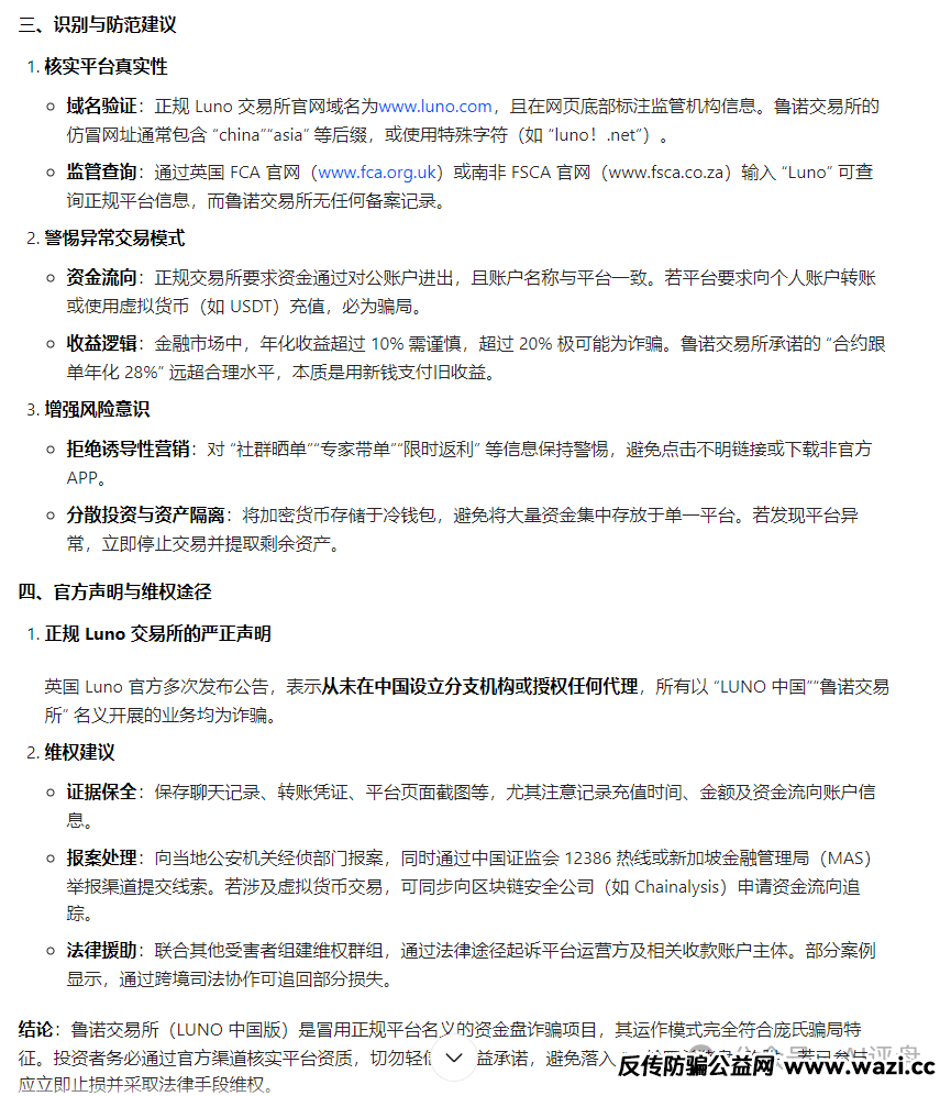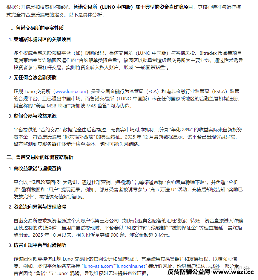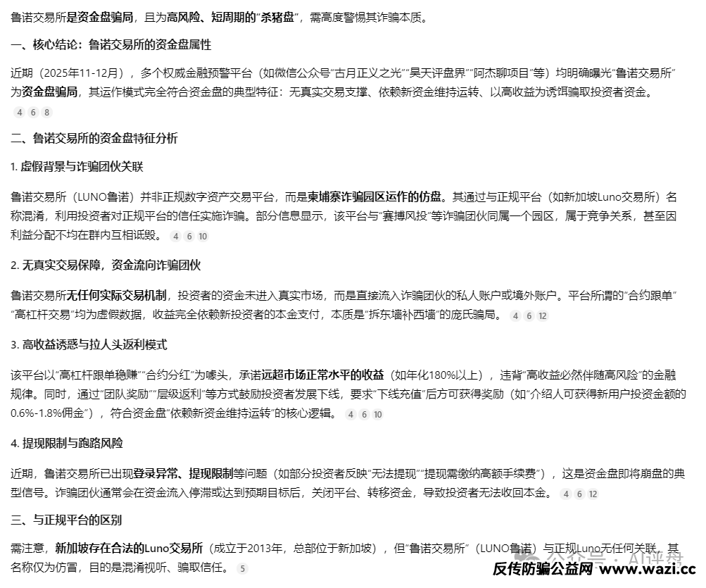 豆包也指出,这个鲁诺交易所是假冒正规交易所的骗局。并且从域名、交易模式、官方声明等方面进行揭秘。 请大家认清国内这个鲁诺交易所是一个资金盘骗局,是来割韭菜的,千万不要参与,如果已经加入了,快快出来,可能快崩盘了!!